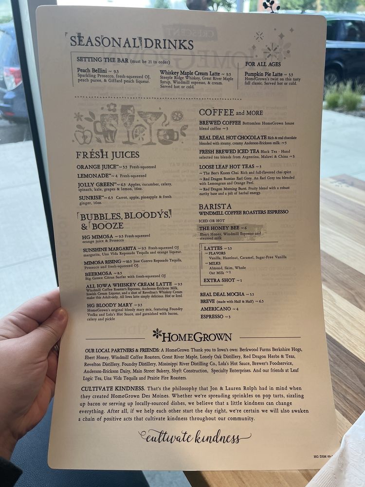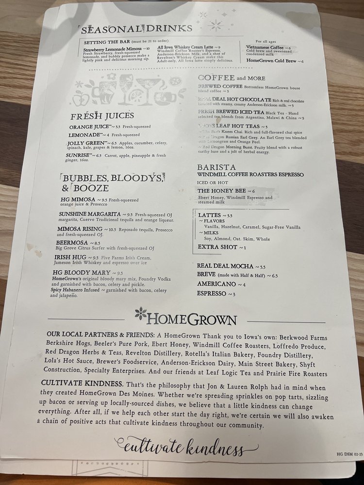 Introducing the menu at HomeGrown - Des Moines, a breakfast and brunch hotspot in Des Moines, IA. This restaurant offers a wide range of options, from classic buttermilk pancakes to gluten-free friendly dishes. Their unique dishes like the HomeGrown Brunch Chili and Winterberry toast showcase their creativity and commitment to delicious flavors. Customers rave about the Nutella pop'd heart and the Salsa Verde Pork, highlighting the innovative and mouth-watering offerings at HomeGrown. The restaurant's ambiance is vibrant and family-friendly, with attentive service and a welcoming staff. If you're looking for a charming spot with hearty and flavorful dishes, HomeGrown - Des Moines is a must-visit destination.